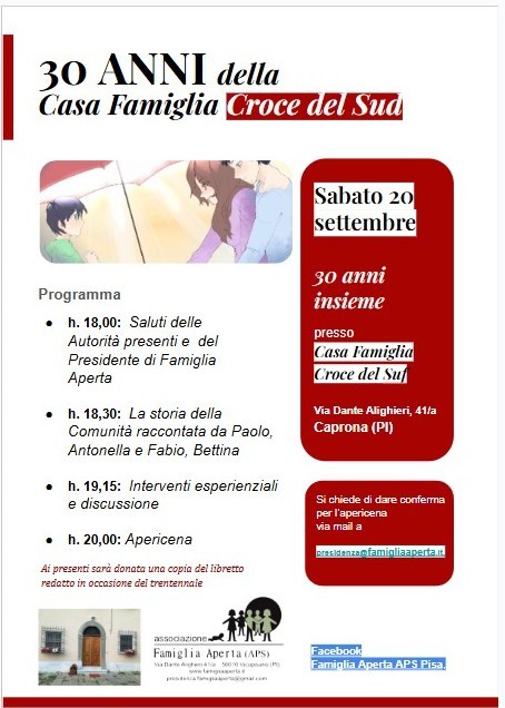 Caprona, 20 settembre 2025. Sabato pomeriggio presso la Casa Famiglia “La Croce del Sud”, l’Associazione Famiglia Aperta APS, , ha festeggiato i trent’anni di attività di questa realtà per l’accoglienza di bambini e bambine in difficoltà, in una bellissima casa data in comodato dalla Diocesi di Pisa.